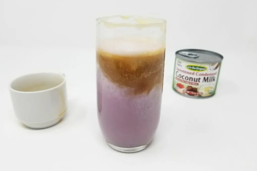- Once the purple yam drink for the base tastes right, add ice (if using), and pour on the cream. On top of that layer the espresso or coffee; alternately you can whip the cream rather than add it directly, and layer the whipped cream on top of the ube latte (this works whether it's hot or iced). Then add a straw and enjoy! I like to rim mine with a bit of condensed milk for sweet sipping, but you could also add sprinkles.