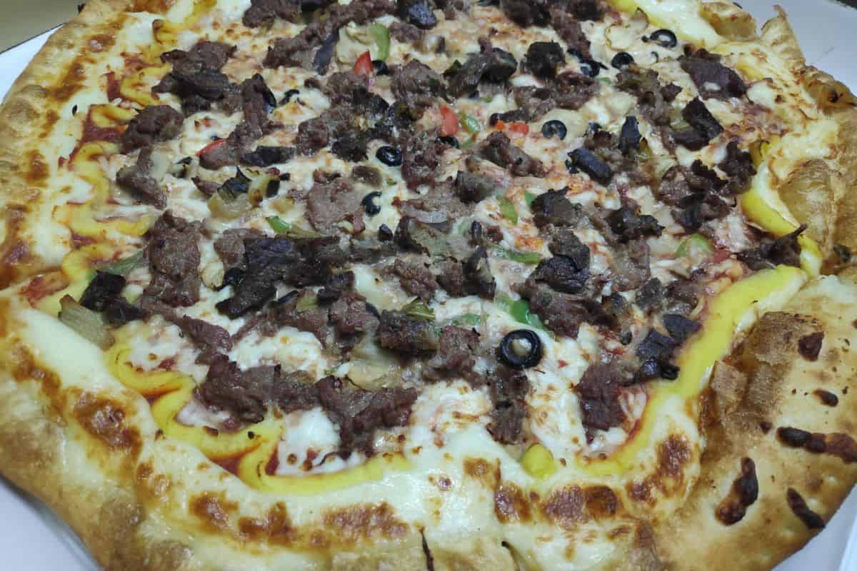 This pizza features Bulgogi—a marinated Korean beef. Along with mushrooms, olives, onions, corn kernels, and bell pepper, it's a savory treat. Baked at 392°F for 10 minutes, the result is a delicious fusion of flavors.